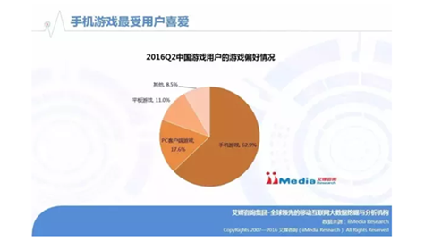 9月2日,艾媒咨詢發(fā)布《2016Q2中國手機游戲市場季度監(jiān)測報告》(以下簡稱《報告》),數(shù)據(jù)顯示,2016Q2,中國手機游戲市場規(guī)模達232.6億元;中國手機游戲用戶規(guī)模達5.12億,市場整體和用戶兩者的增長勢頭均保持持續(xù)放緩。數(shù)據(jù)中還顯示,2016Q2,62.9%的受訪用戶表示最喜歡的游戲類型為手機游戲;手機游戲由于硬件便攜、操作門檻低等原因受到了用戶的歡迎。